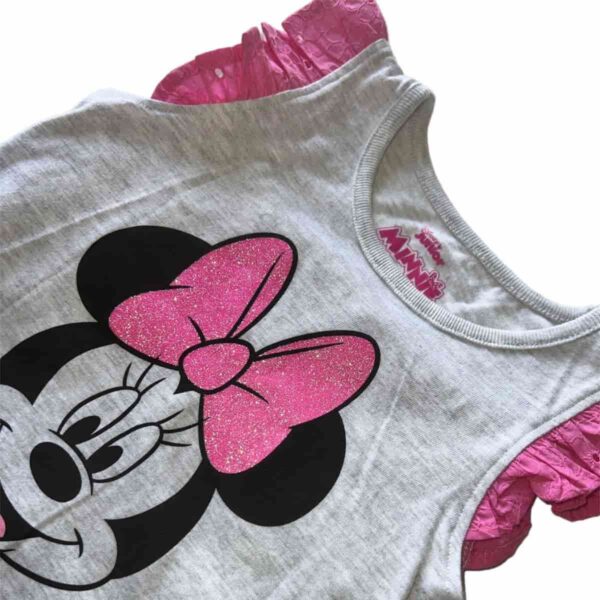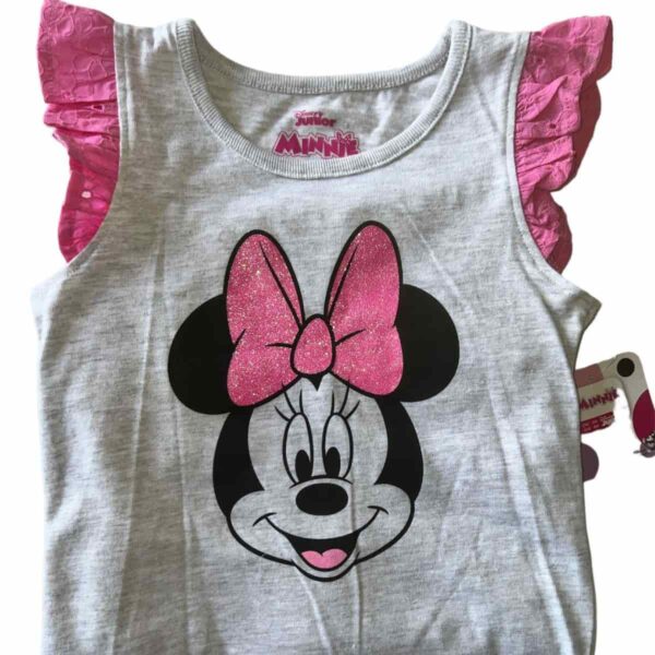 Con Minnie Mouse con su bonita cara sonriente en la camisa. divertido bordado de flores en la parte inferior.